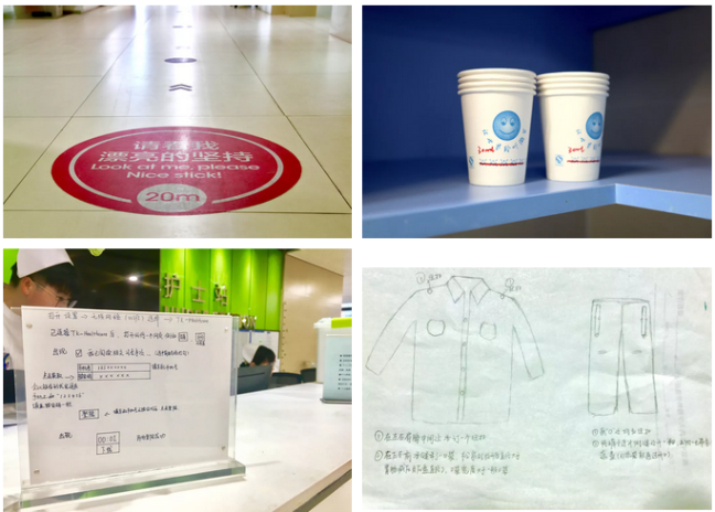 充满鼓励话语的地贴、标好刻度线的纸杯、手绘的上网流程、病号服改造设计