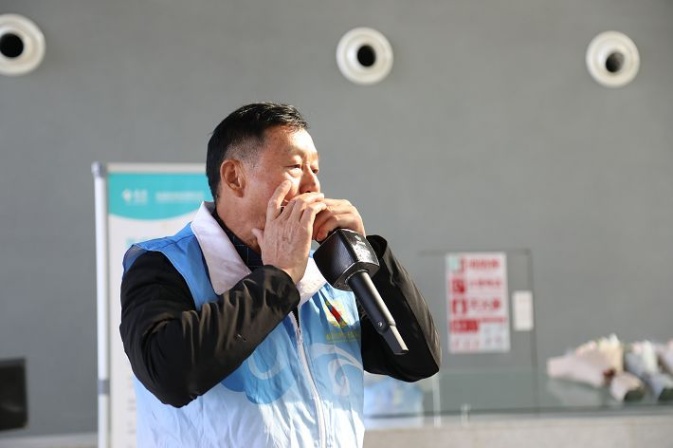 志愿者丁仁义正弹奏《贝加尔湖畔》