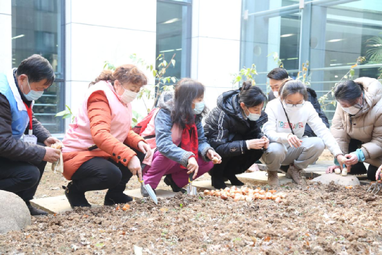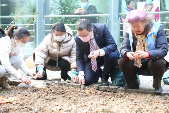 随后,捐赠方代表与志愿者代表一起,将郁金香花球种入“溢彩园”。期待2个月之后这里可以花香四溢,满庭芬芳!