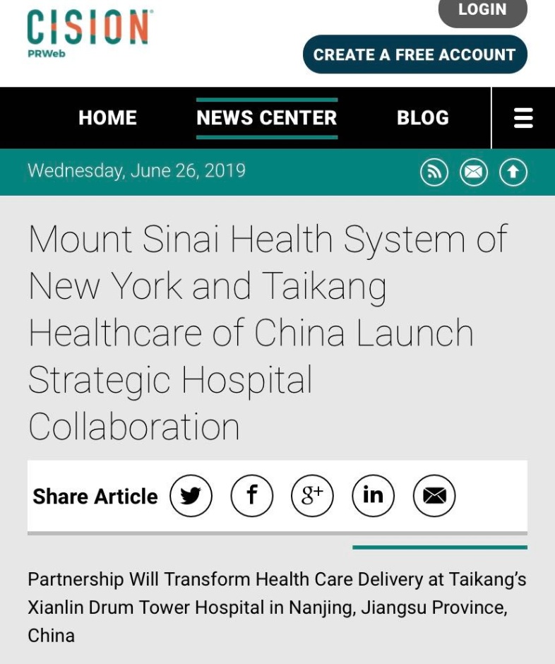 CISION刊登我院与西奈山医院建立战略合作关系