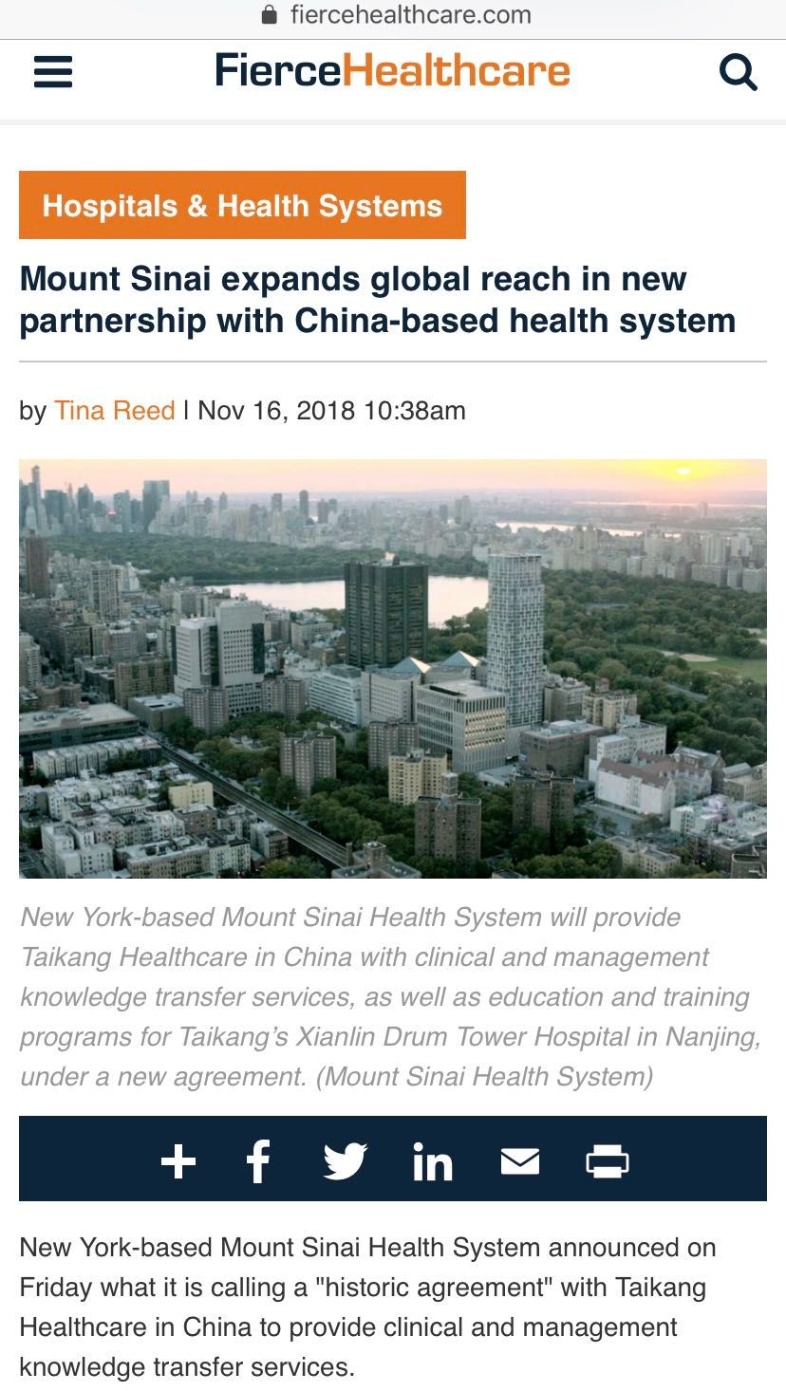 FierceHealthcare刊登我院与西奈山医院达成合作